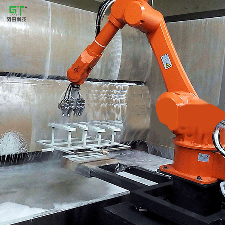 機械手噴釉屬于自動噴釉,其全套設備主要包括坯體傳送聯(lián)動線、可控制轉(zhuǎn)動角度的承坯臺、噴
