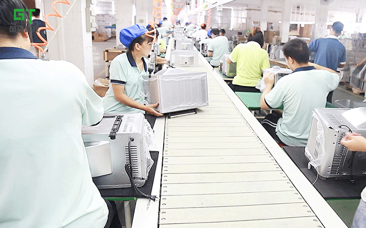 主要由鏈板輸送線組成,鏈板輸送機的輸送面平坦光滑,摩擦力小,可以游刃有余地輸送烤箱配件并進行組裝。